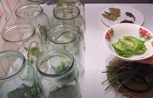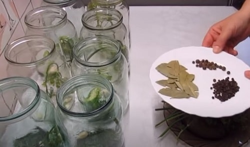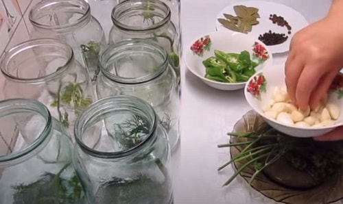 На денце кожної літрової банки покладіть по гілочці кропу, пару-трійку часниковий зубків.