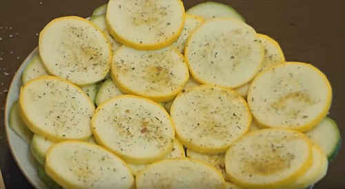Складіть їх на тарілку шарами, один на одного. Кожен шар присоліть, і посипати приправами. Залиште на столі приблизно на 20 хвилин, щоб овочі замариновались.