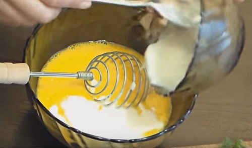 Вбийте в миску яйця, трохи збийте вінчиком. Залийте сметану, знову енергійно розмішайте.