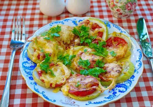 Кабачки, запечені під сиром, з помідорами і майонезом