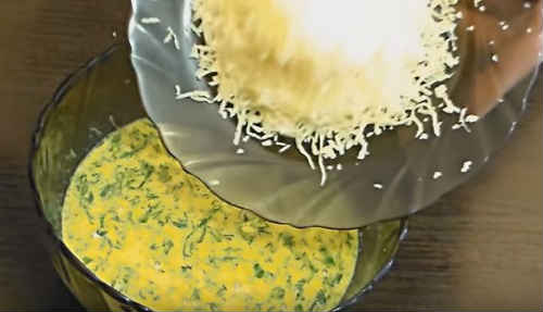 Потріть сир на дрібну терочку, засипте в заправку. Ще раз перемішайте масу. Оскільки заливка не солона, засипте трохи спецій або просто трохи посоліть.