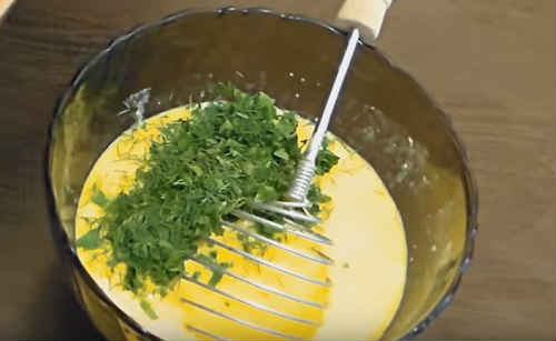 Порубаєте зелень, введіть в яєчну заливку.