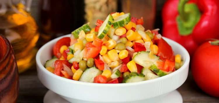 Свіжі овочі порізати кубиками. Викласти в салатник кукурудзу та горошок, додати нарізані овочі, спеції. Все перемішати, збризнути лимонним соком.