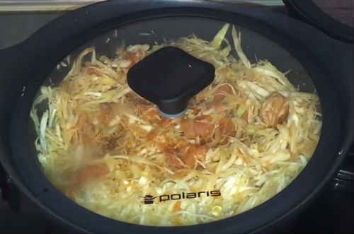 Знову закрийте каструлю, тушкуйте до готовності м’яса і капусти. На це піде приблизно 15-20 хвилин. Час залежить від того, яку капусту ви любите. Якщо м’якше, то чверті години не достатньо. Додайте ще 5-7 хвилин.