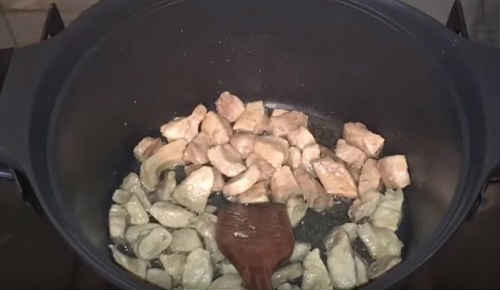 - Наріжте філе смужками довільного розміру. Додайте до овочів. Продовжуйте смажити компоненти, поки грудка не стане м’якою. На це піде близько 10 хвилин.