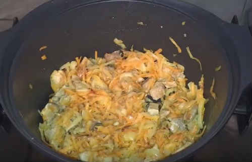 - Зверху викладіть капусту. Шари дозволяється поміняти на свій розсуд, оскільки в кінці приготування доведеться все перемішати.