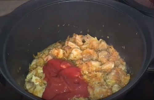 - Викладіть томат, розмішайте. Варіть на тихому вогні до готовності м’яса.