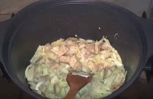 Коли м’ясо трохи підрум’яниться, додайте цибулю. Смажте, помішуючи, щоб нарізка стала прозорою.