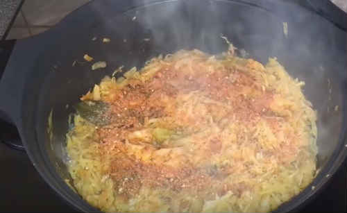 - Солити страву не потрібно, але от поперчити необхідно. Додайте квашену капусту. Неодмінно спробуйте її перед закладкою та оцініть кислоту капусти. Якщо кислувата – промийте, але після добре відіжміть.