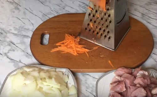 - Окремо обсмажте цибулю, шінкованной кубиком, додайте терту великої стружкою морквину. Потім, коли овочі трохи зарум’яняться, додайте м’якоть солодкого перцю, порізаного кубиками. Через 5 хвилин зніміть з плити.