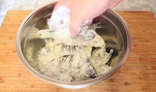 Перелийте сметанний соус в миску з рибою, гарненько перемішайте руками.