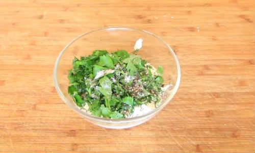 Тим часом порубаєте зелень, перекладіть в миску зі сметаною. Підсолити, здобріть перцем, гарненько розмішайте. На даному етапі ви зможете додати будь-які приправи, якщо побажаєте. Приміром, коріандр, який карась дуже любить.