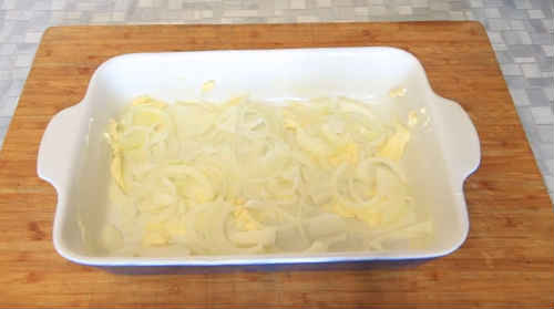 Форму для запікання щедро промажте вершковим маслом. Поверх розкидайте цибульну нарізку.