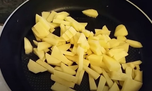 - На окремій сковороді посмажте картоплю, порізану соломкою.