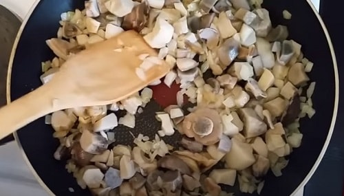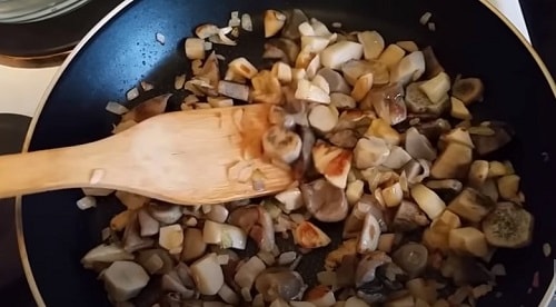 Через кілька хвилин, коли цибуля зарум'яниться, додайте трохи охолонули грибочки.
