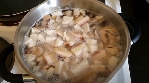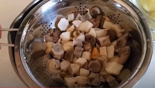 - Переберія лісову видобуток, наріжте, відваріть в підсоленій воді приблизно 15-20 хвилин. Потім злийте відвар.