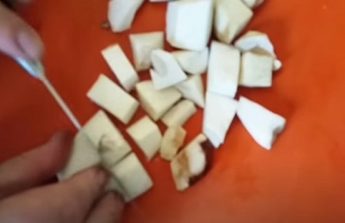 Добре промийте, наріжте кубиками досить великого розміру, оскільки білі при тепловій обробці зменшаться в розмірах.