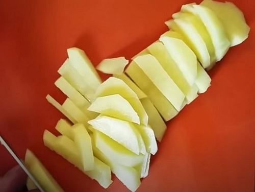 - Почистіть картопляні бульби, наріжте соломкою. Посмажте на окремій сковороді.