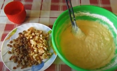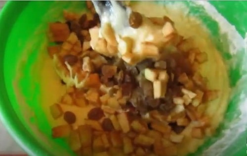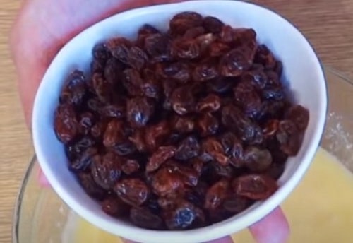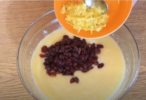 Перекладіть в тісто, додайте підготовлений до того часу родзинки. Гарненько перемішайте вміст.