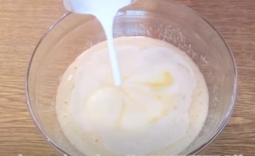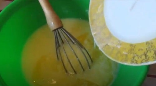- В окрему миску влийте кефір, додайте соду. Перемішайте з яєчної сумішшю, старанно перемішайте або збийте міксером.