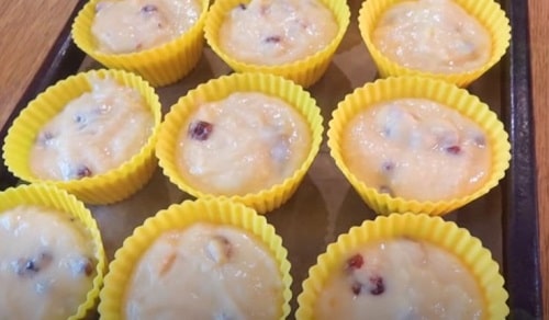 - Коли замісіть тісто, по густоті схоже зі сметаною, додайте порізаний шматочками банан. Перелийте масу у жароміцних форму.