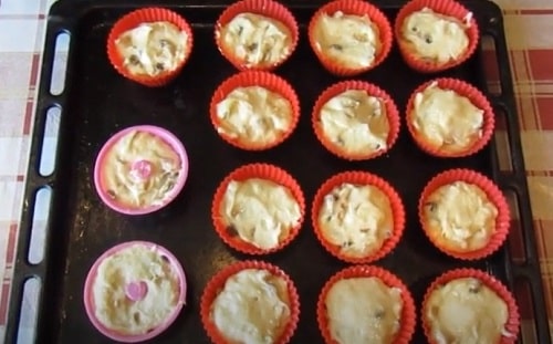 Розкладіть тісто по силіконовим формам, наповнивши приблизно на ¾ об'єму. Якщо станете використовувати інші форми, обов'язково змастіть їх маслом.