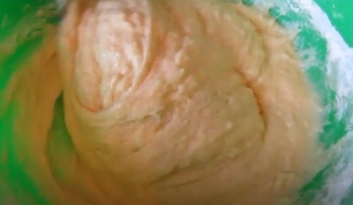 У підсумку тісто стане по консистенції нагадувати дуже густу сметану. Спочатку замішують віночком, потім зручніше буде працювати ложкою. На стіл маса не переноситься.