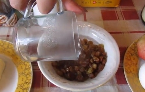 Насамперед запарьте родзинки, щоб він встиг просочитися і набрякнути. Для цього залийте його окропом на чверть години. Потім промийте і просушіть.