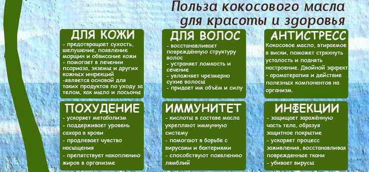 - Одним з найсильніших антиоксидантів є лауринова кислота, яка бореться з жировими клітинами, її зміст дорівнює 50%. Жирні кислоти, присутні тут, тонізують шкіру, підвищують пружність (еластичність підвищується на 43%), запобігають обвисання шкірних тканин, проводять профілактику розтяжок і целюліту.