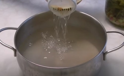 Закип’ятіть воду, акуратно залийте її у трилітрові ємності, щоб скло не тріснуло. Прикрийте кришками. Залиште на 30 хвилин, щоб вміст встигло добре прогрітися.