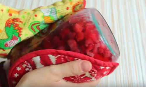 Баночку обов’язково покрутіть, щоб цукор не прилип до дна, що часто буває. Поставте ємність на кришку, дном вгору. Тепло укутайте, залиште остигати.