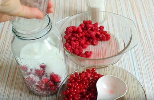 Розкладіть обидві ягідки в баночки, наповнивши на 1/3. Зовсім не обов’язково класти смородину та малину в рівній пропорції. Можливо, який-небудь з них ви віддасте перевагу, тоді покладіть більше.