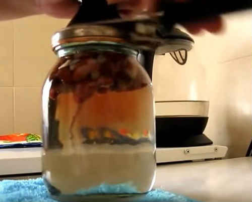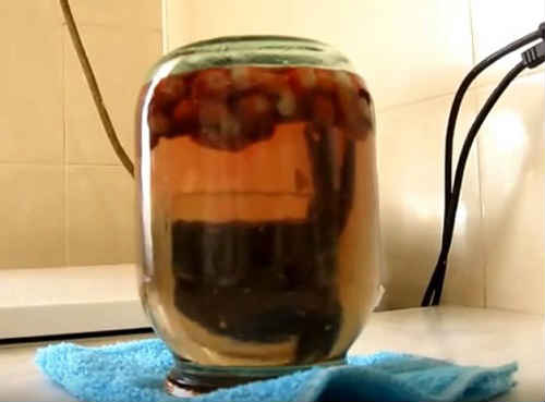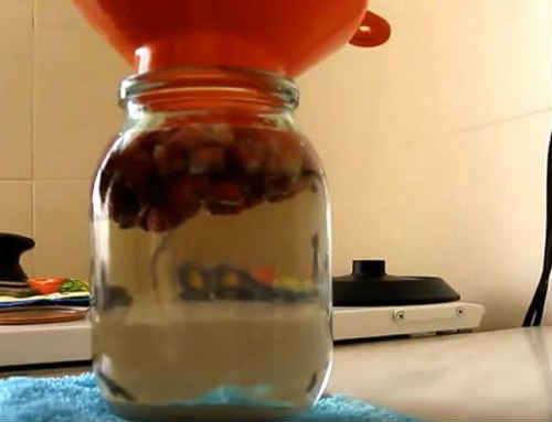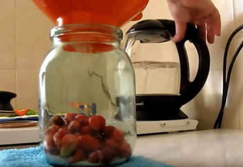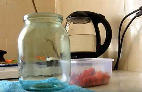 Закип’ятіть достатню кількість води, залийте заготовку. Прослідкуйте, щоб вода була до краю горлечка, і навіть трохи переливалася, саму крапельку.