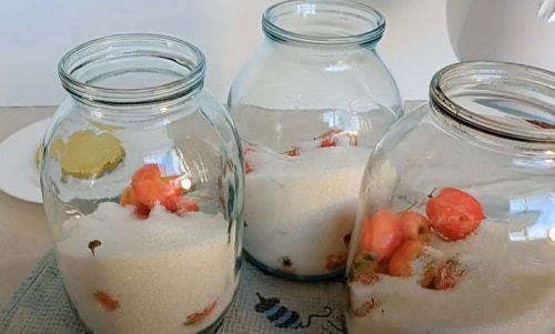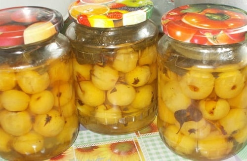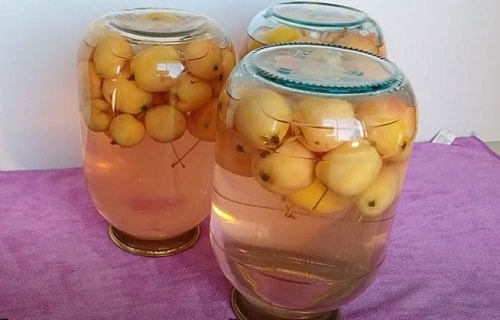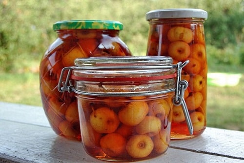 - Зваріть сироп з води з вказаною кількістю цукру. Залийте в плоди. Відразу укупорьте будь-яким способом і повільно охолодіть під ковдрою. Зберігайте в холоді.