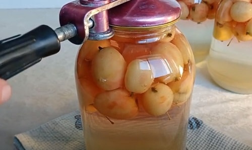 - Швидко перелийте сироп в плоди. Укупорьте будь-яким способом, переверніть, не поспішаючи охолодіть під теплим укриттям. На ранок не забудьте перевірити якість закачування.