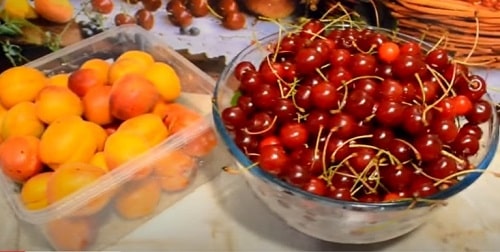 - Підготуйте плоди вишні, помивши і просушивши. У абрикосів вийміть кісточки і поділіть на половинки.