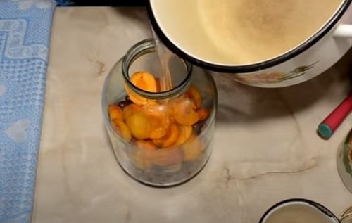 - Укладіть в банки, чергуючи вишню з половинками абрикосів. Наповнюйте ємність до половини або вище, на свій розсуд.