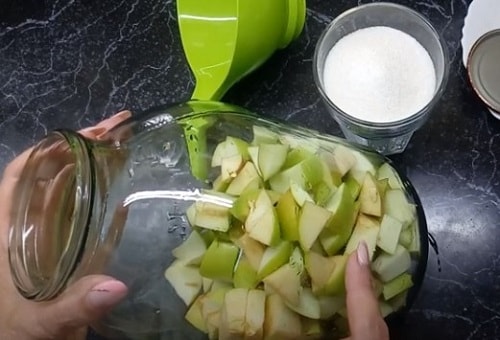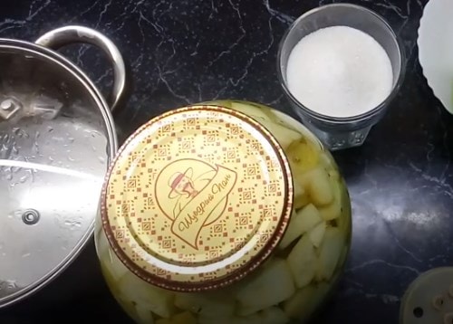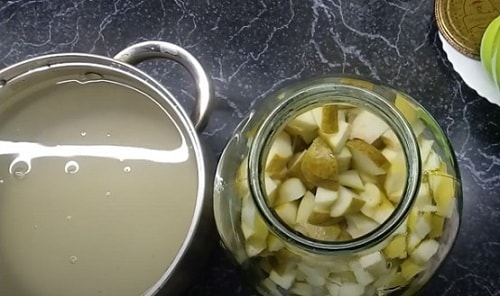 - Зробіть другу заливку, але вже сиропом. Якщо консервуєте фрукти цілком, то для додаткового захисту можна робити методом потрійний заливки (сироп вариться, коли груші з яблуками вже двічі прогріли).