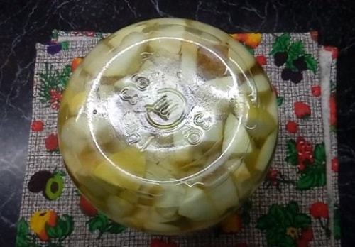 - Технологія консервування не відрізняється від заготівлі компоту в трилітрових місткостях і робиться методом подвійного заливки. Плоди бажано нарізати часточками або кубиками, як в рецепті з апельсинами.