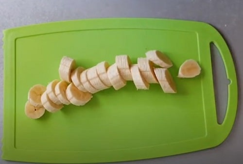 Обполосніть банан, зніміть шкірку. Наріжте кільцями.
