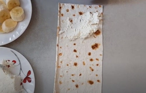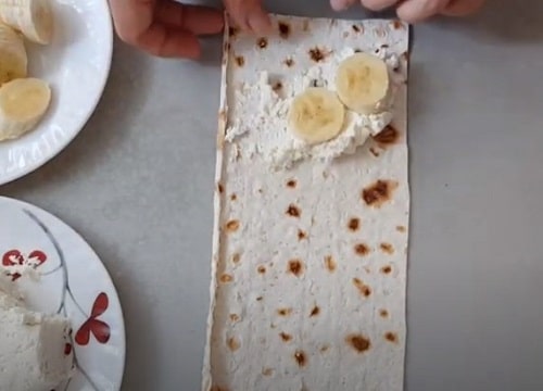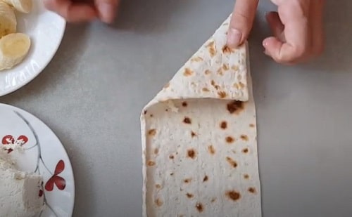 - Поділіть пласти коржів на 3-4 частини. На край кожної смужки покладіть по ложці наповнювача. Сформуйте конвертики, щоб сирна начинка виявилася усередині.