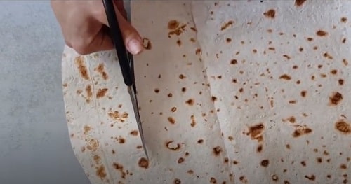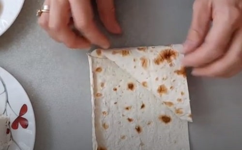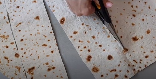 - Наріжте коржі лаваша на 4 квадрати 20 на 25 см.