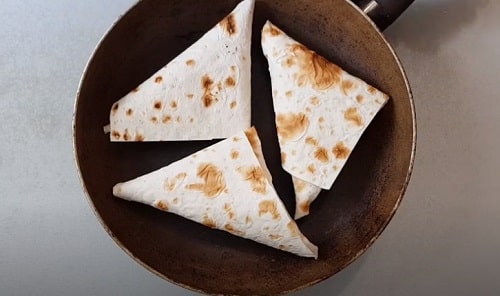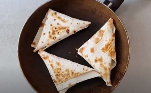 - Обсмажте на сковороді без додавання масла з обох сторін, тоді трикутник стане хрустким. Ніхто не заборонить вам посмажити заготовки на вершковому маслі. Можна вмочити в збите яйце, щоб вийшла рум'яна кірочка – варіацій безліч, як бачите.
