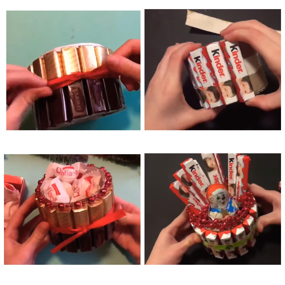 Дуже простий варіант – обклеїти маленькими шоколадками або цукерками, за допомогою двостороннього скотча або клею, картон або втулку від скотча. Для невеликого подарунка підійде навіть втулка від туалетного паперу. Приклеюємо дно, прикрашаємо стрічками і отримуємо дуже цікавий варіант солодкого подарунка, всередину якого можна помістити і інші презенти.