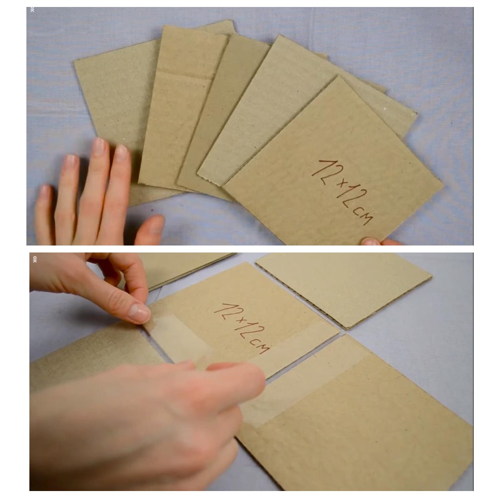 - З’єднуємо квадрати в формі хреста за допомогою скотча, бажано з обох сторін. Між стінками і дном залишаємо невеликий зазор, щоб можна було її розкрити, а потім зібрати без зусиль.