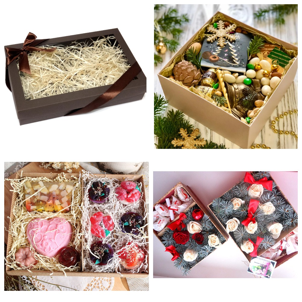 Якщо присутні сумніви у власних можливостях рукодільничати, найпростіший варіант – взяти і прикрасити вже готову конструкцію. Звичайні коробки обв’язують бантами, стрічками, мереживом, приклеюють на скотч, клей або гарячий пістолет різноманітні прикраси. До новорічних подарунків додаємо зимові сувеніри – шишки, намистини, кульки. І вже потім складаємо смачненьки.