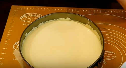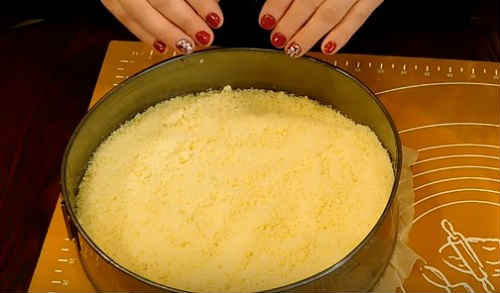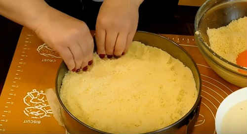 Останній етап – випічка. Викладіть дно рознімної форми пекарської папером, промажте її будь-яким маслом. Переправте 2/3 крихти від загальної кількості у форму, розрівняйте. Беріть невелику форму, 22-26 см, щоб тісто не заповнила її доверху, залиште місце для начинки.