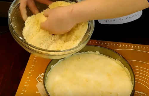 - У тісто підсипте ще 2 ложки борошна, перетріть його в більш дрібну крихту. Засипте начинку.