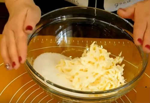 - З склянки цукру, натертого великої стружкою масла і розпушувача зробіть однорідну масу.