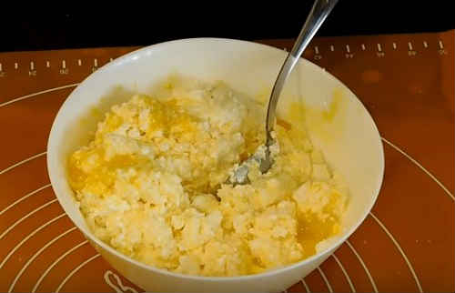 - Зробіть начинку. Розітріть або подрібніть блендером сир, додавши в нього яйця і цукровий пісок.